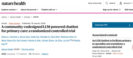 Li, S., Li, Y., Zhou, S. et al. A community-codesigned LLM-powered chatbot for primary care: a randomized controlled trial. Nat Health (2026). https://doi.org/10.1038/s44360-025-00021-w
