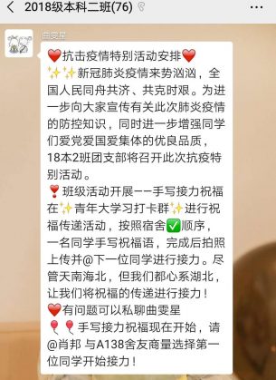 18本2班团支委积极响应这一倡议,在与张老师协商后,拟定开展新冠肺炎疫情主题团课及为武汉手写祝福两项线上班级活动。