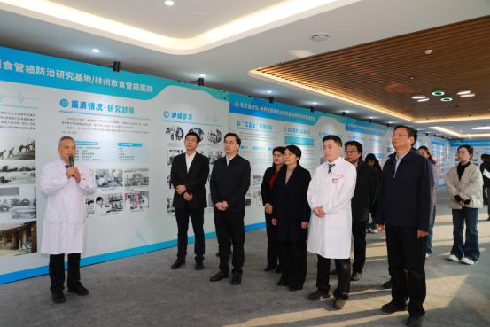 在林州食管癌医院院史馆和北京医疗队工作旧址,领导专家们详细观看了数十年来北京医疗队队员在林州开展工作的具体情况介绍。一张张老照片,让60多年来北京医疗队在林州工作的真实情景,生动地浮现在大家的眼前。60多年前,北京医疗队以“不破楼兰誓不还”的决心意志,在林县摸情况、找病因、建基地、攻难关,开辟出了另外一条时间上的抗癌之河,真正把论文写在了人民的健康事业中。