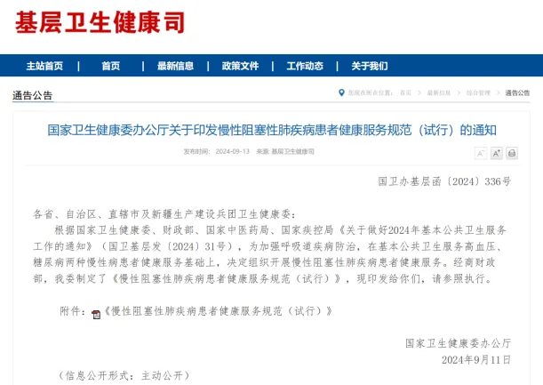2024年9月13日,国家卫生健康委、财政部、中医药局、国家疾控局联合发布了《关于做好2024年基本公共卫生服务工作的通知》,国家卫生健康委办公厅同时发布《慢性阻塞性肺疾病患者健康服务规范(试行)》,要求在基本公共卫生服务中增加慢阻肺病患者健康服务。这是继7月份国家卫生健康委等13个部门联合制定《健康中国行动——慢性呼吸系统疾病防治行动实施方案(2024-2030年)》后,加强慢性呼吸疾病防治的又一重要举措。
