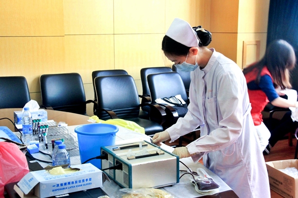 (工作人员在为献血者抽血化验)