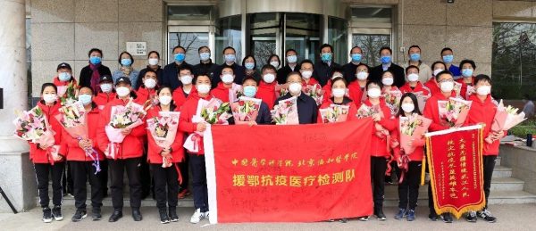 当天,院校在协和汤山健康隔离中心举行了简约而热烈的欢迎仪式。院校领导和各所院领导为检测队员们献上鲜花,代表全体师生祝贺他们实现“零感染,打胜仗,凯旋归”目标,表达对援鄂英雄的诚挚感谢和崇高敬意。