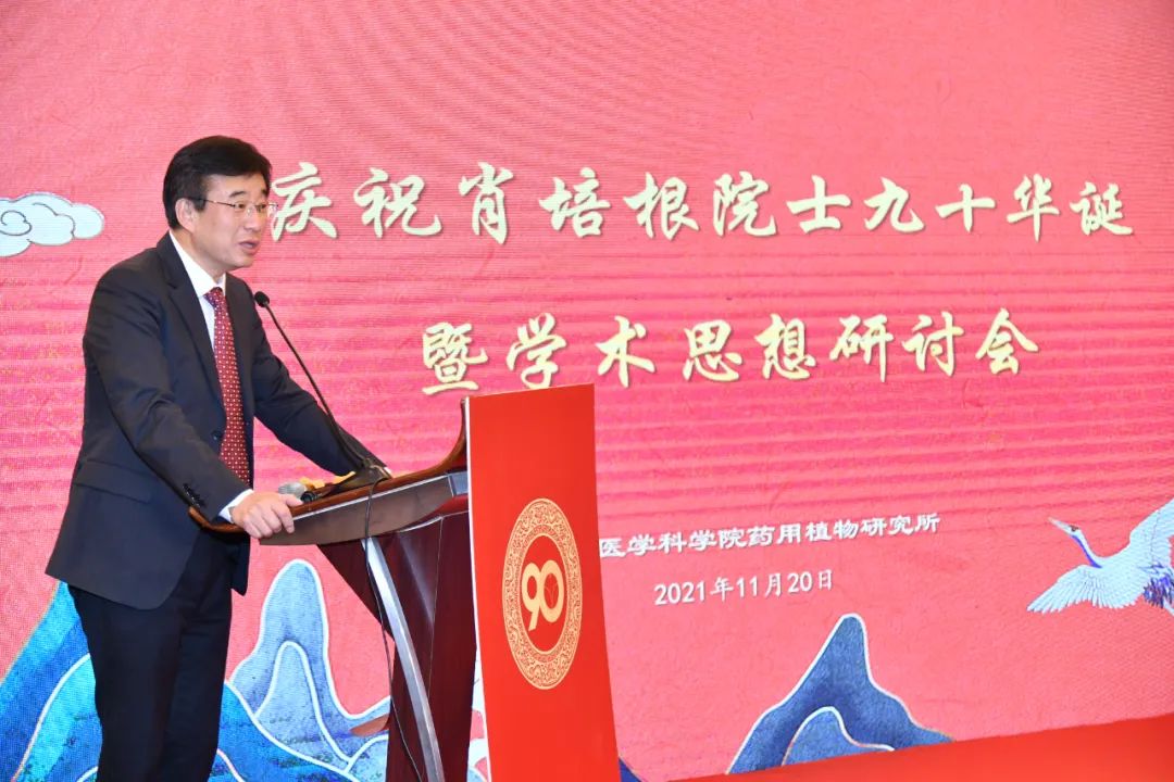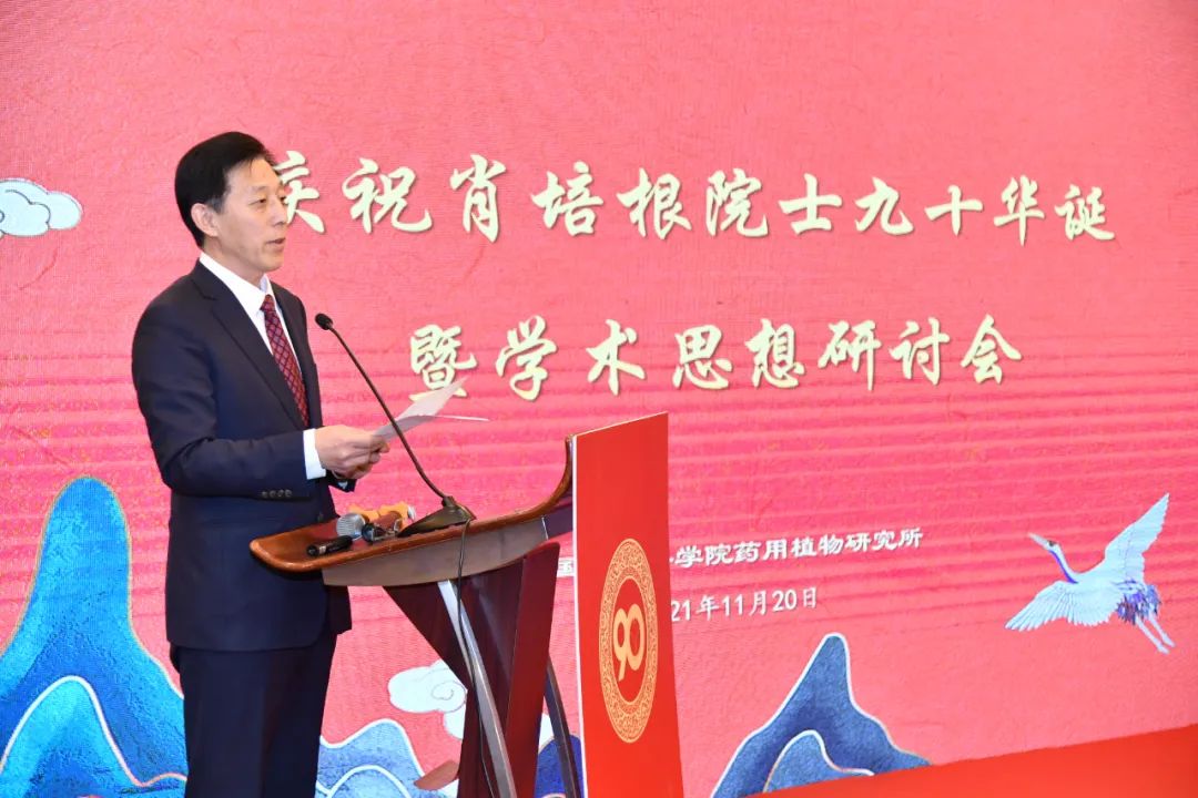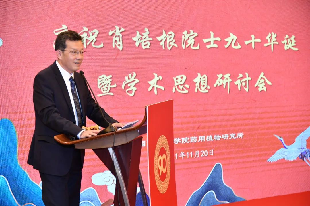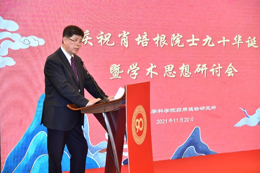 黄璐琦院士、王国辰秘书长、药用植物研究所党委书记范晓明先后致辞,表达对肖培根院士的崇高敬意和热烈祝贺。药用植物研究所所长孙晓波以《汇通古今,踏遍青山建伟业;学贯中西,纵横五洲创未来》为题,系统回顾了肖培根院士创立药用植物亲缘学、开创药用植物三级开发战略理论等方面的学术思想和开创性成就,并号召药植所师生职工弘扬和传承老一辈科学家热爱党,热爱祖国的崇高理想和信念,学习他们的精勤不倦,勇于创新的治学精神,不忘初心再图强、实事求是促发展,在建设药用植物科技创新体系核心基地征程中创造新的辉煌。