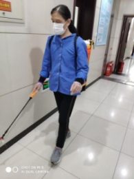 保洁人员无怨无悔,从清晨到傍晚,从院内到楼道,保洁着药物所的角角落落。她们每天定时对院内干道、卫生间、楼道、各会议室、垃圾场等公共区域进行喷洒消毒,并为电梯按键、门把手、门禁数次擦拭酒精,不遗落任何一个卫生死角。