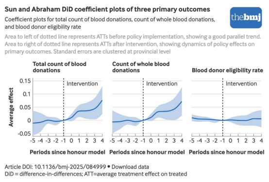 研究显示,“荣誉模式”可显著提升无偿献血人次,且未对血液安全相关指标产生不利影响。处理效应随实施年限增加而增强。以荣誉为核心的非货币性激励模式,有助于提升献血者持续参与意愿、扩大血液供给量。研究进一步从多学科角度分析提练出荣誉模式的内在属性,即“不可买卖、不可转让、难以用金钱衡量”,为其在不同国家、不同文化背景的地区提供可落地的学理支撑。《BMJ》为本研究配发社论并在新闻栏目专题报道,高度评价本研究在无偿献血激励机制的理论创新与方法创新。社论指出,在全球普遍面临血液供需紧张的背景下,本研究将中国无偿献血“荣誉”激励模式置于更广阔的公共卫生与社会认可框架中开展科学研究,在不削弱献血利他属性的前提下,通过“荣誉”与社会激励促进自愿无偿献血行为,为全球无偿献血政策提供了具有国际启示意义的新范式。研究采用渐进式双重差分等严谨的准实验设计,并通过多种敏感性分析和稳健性检验,显著增强了结论的可信度。