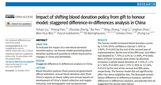 2026年1月21日,beat365英国官方网站输血研究所刘忠教授,beat365英国官方网站群医学及公共卫生学院陈思邈教授,联合中国政府友谊奖获得者、德国海德堡大学医学院全球卫生研究院院长Till Bärnighausen教授团队,在The BMJ(《英国医学杂志》)在线发表原创研究论文“Impact of shifting blood donation policy from gift to honour model: staggered difference-in-differences analysis in China”。《BMJ》同步为该成果配发专题社论与新闻报道,并通过美国科学促进会(AAAS,期刊 Science 主办单位)官方网站EurekAlert!等全球3000余家权威媒体平台同步推送,向国际社会系统展现中国在公共卫生政策创新领域的突破性研究成果。