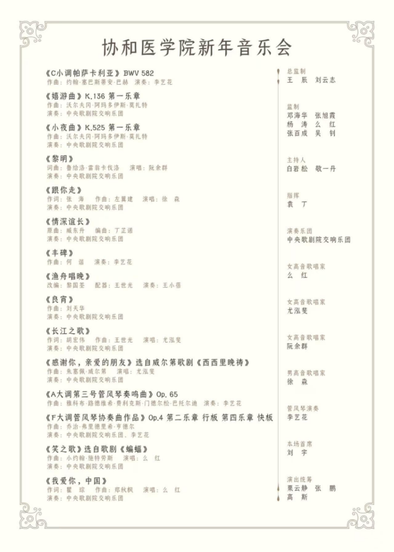音符渐止,余音绕梁。光影编织梦幻,乐韵悠扬流淌。协和的历史和未来在此交汇,医学与艺术相映成辉。在新的一年里,协和医学院将以更加坚实稳健的步伐不断向前,持续推进医学科技创新体系核心基地的建设,为建设健康中国、增进人民健康福祉做出更大贡献。