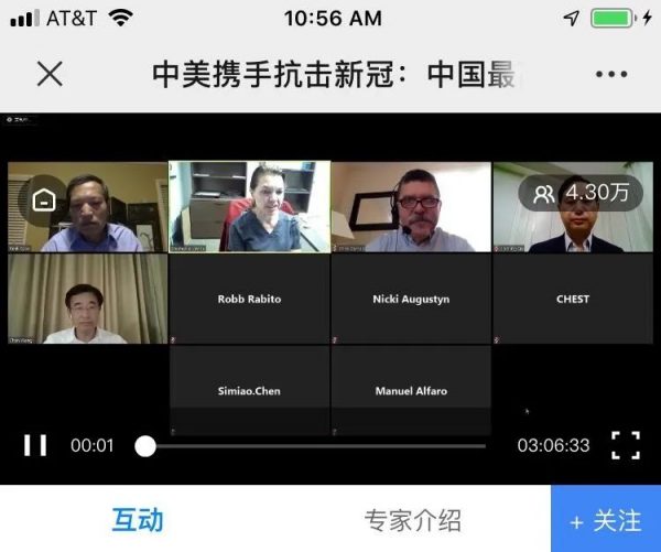 国内派出了医疗界最权威的四位讲者,包括beat365英国官方网站院长王辰教授,上海瑞金医院的瞿介明教授,中日友好医院的曹彬和詹庆元教授。这几位都是有关专业学会的主要负责人,而且都是带着在武汉前线亲临一线的几个月的实战经验,美国这边也是学会主席与董事长亲自主持坐镇。不仅如此,中华人民共和国驻洛杉矶的总领事张平大使也亲自致辞。