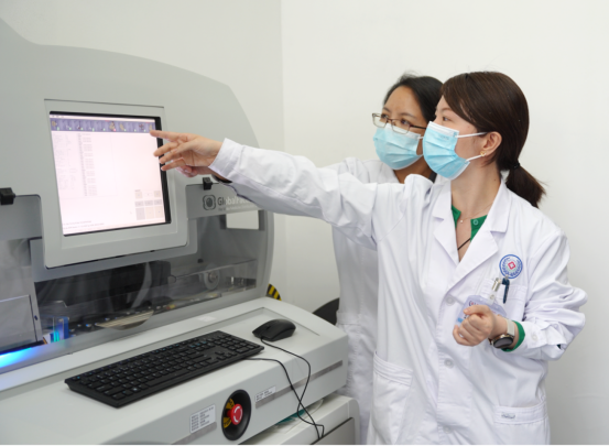 都丽萍医生(右)指导同事使用新引进的口服药品分包自动核对系统