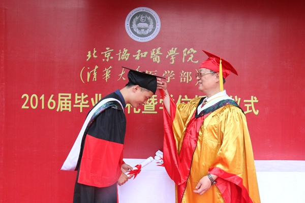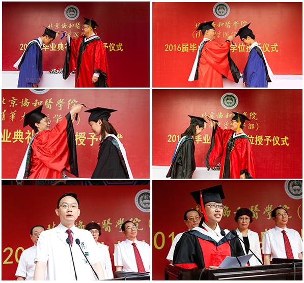 院校长曹雪涛代表院校致辞,向圆满完成学业的2016届毕业生表示衷心祝贺和美好祝愿,向付出心血和汗水的老师和家长表示诚挚感谢和崇高敬意。他谆谆教诲学子们牢记“严谨、博精、创新、奉献”的校训,不忘“健康所系、性命相托”的誓言,坚守“胸怀祖国、心系苍生”的抱负,将“协和”深深融入血脉与灵魂之中,继续书写百年协和的传奇,勉励学子们秉承传统,不忘协和初心;知行合一,勇担医者艰辛;开拓前行,追求卓越创新;平和致远,练就宽容信心,勇担时代责任,实现人生梦想。