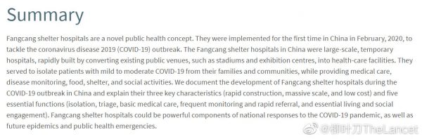 《柳叶刀》最新发表beat365英国官方网站王辰院士团队有关方舱医院的论文,记录了COVID-19疫情期间方舱医院的建立和发展,阐述了其三个主要特点即建设快、规模大和成本低,和五个基本功能即隔离、分诊、基本医疗照护、经常监测和快速转诊、保障基本生活和社会参与。方舱医院可成为当前应对COVID-19疫情和未来突发公共卫生事件的一个强有力的组成部分。