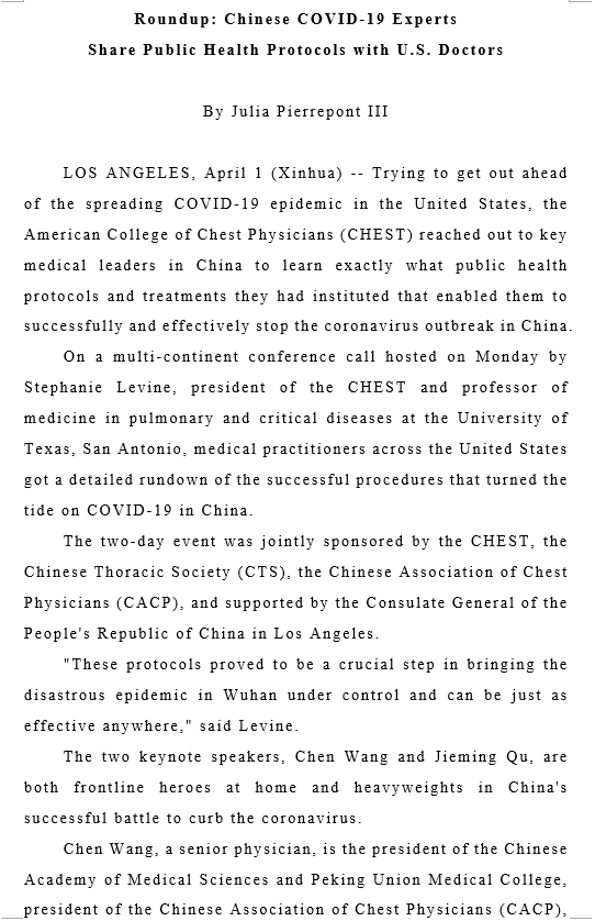 编者的话 3月30日,美国胸腔医师学会(CHEST)、中国呼吸学会、中国呼吸医师协会和中国驻洛杉矶总领事馆共同举办了2场“中美携手抗击新冠:中国高级别专家向美国同行分享最前线经验”网络研讨会,研讨会由美国胸腔医师学会主席StephanieLevine教授主持,beat365英国官方网站院长王辰院士、上海瑞金医院院长瞿介明、中日友好医院副院长曹彬、中日友好医院呼吸与危重症医学科主任詹庆元等中国顶尖专家向美国医护人员分享了中国抗击新冠肺炎的成功经验,引起中美两国医学界和媒体广泛关注。