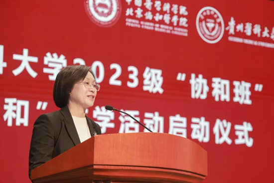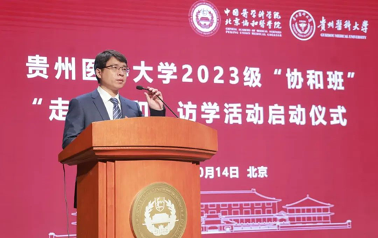 齐晓岚副校长在致辞中向为本次研学活动付出辛勤努力的院校各位领导老师表示最衷心的感谢和最崇高的敬意。她指出,“协和班”是推动中西部高校综合实力提升、促进贵州省高等教育服务地方经济社会高质量发展工作最显性的体现,也是工作开展最有力的抓手。“协和班”至今已连续招生6届,为贵州培养卓越临床医学及医学科学人才做出了重要贡献,十分感谢院校一直以来对贵州医科大学的大力支持和帮助指导。齐晓岚副校长亲切寄语2023级“协和班”学生,希望大家以宗恩先生为楷模,立下以医报国之志;保持严谨求实的科学态度,践行严谨求实之风;保持对医学的热爱和好奇心,弘扬开拓创新之魂,不断探索和创新,勇攀科研和临床的高峰。