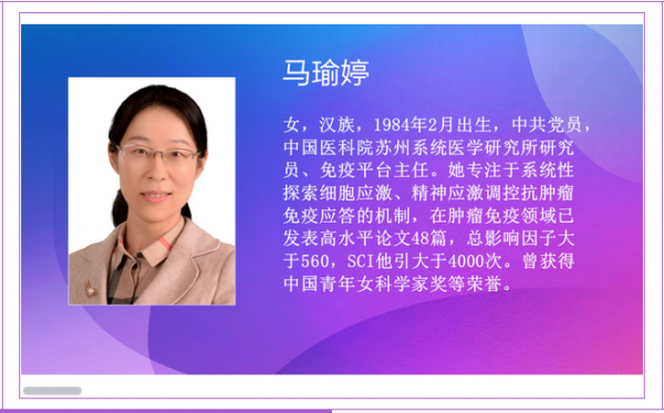马瑜婷研究员在入职的5年时间里,带领科研团队开创性地探索了“精神应激”对抗肿瘤免疫应答的调控机制,建立了完备的肿瘤免疫学、神经内分泌学、行为学、细胞生物学及生物信息学研究平台,实现了实验流程及数据分析的标准化。她积极承担国家及省部级多项重点/重要科研项目,已在Science、Nat Med、Immunity等国际高水平杂志发表48篇论文,总影响因子>560,SCI他引4000余次。