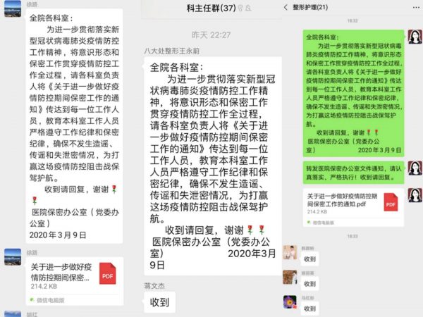 医院将意识形态和保密工作贯穿疫情防控全过程。向全院各科室发出《关于进一步做好疫情防控期间保密工作的通知》,要求全院干部、职工从政治和全局高度,充分认清疫情防控期间保密工作的重要性、艰巨性和紧迫性。各科室负责人要切实承担起保密监督管理责任,全面加强办公保密管理,工作人员要严格遵守工作纪律和保密纪律,严守保密底线,确保不发生造谣、传谣和失泄密情况,为打赢这场疫情防控阻击战保驾护航。