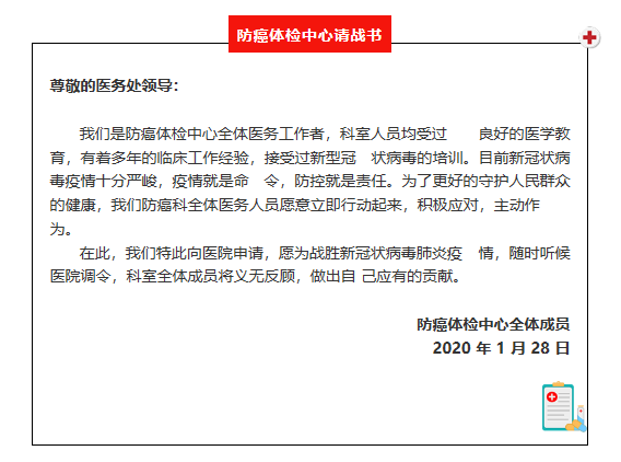 突如其来的疫情,让大家都措手不及。当疫情防控 战役打响时,很多医生都放弃休假提前回京。在第一时间,医院同时接到很多医生和护士的请求,请求到抗击疫情的第一线去。泌尿外科主动报名请战的医生有 17名,护士有 10 名。从老主任到年轻大夫到研究生,个个踊跃报名。“国家兴亡、匹夫有责”“养兵千日用兵一时”,每一条都是那么真诚,每一条都是那么恳切。 在疫情面前,妇科人表现出高度的责任感。在初五、初六半天门诊中,妇科有一位医生有湖北籍人员接触史,需要自行隔离 2周。当妇科吴令英主任在微信中询问大家是否可以替班时,四位医生同时回复:“主任,明天上午我去吧”,温暖着大家,鼓励着每一个人。 疫情考验着门诊的各个岗位。门诊部的护士王素梅是家里的顶梁柱,上有卧床生病的老人,下有需要照顾的孩子,但她说,“我不会说豪言壮语,但我会随时随地听从组织调遣。”门诊部护士张启霞说,“我随时可以到岗,共渡难关!”有这样一群战友和同志在,我们 一定能克服困难打赢这场阻击战。
