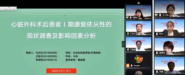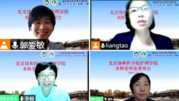 疫情防控期间,为保证本科应届毕业生按时参加答辩和如期毕业,护理学院根据教育部、北京市教委及院校相关文件精神,在保障师生生命安全与健康的前提下,将现场答辩搬上云端,于5月15日采用视频会议方式,开展了护理学院首次毕业论文“云答辩”。本次答辩组教师由临床教学医院护理部主任、副主任、督导、护士长和护理学院教授,副教授等35位临床专家和教师组成,共分为4个答辩小组,为 84名应届毕业生完成了“云答辩”工作。