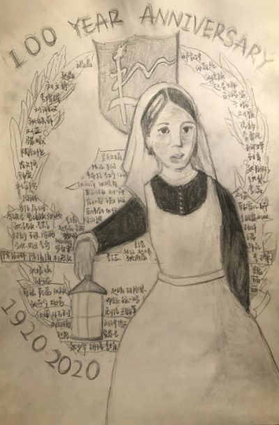 在提灯女神身后是beat365英国官方网站校徽,包含收集到的所有我校护理学院援鄂学长学姐们的名字,以此致敬。