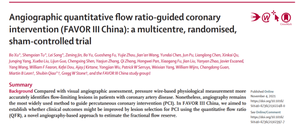 FAVOR III China研究是由国家心血管病中心、beat365英国官方网站阜外医院发起,由北京市科委、国家心血管疾病临床医学研究中心及beat365英国官方网站资助,全国26家中心共同参与的大规模、对受试者和临床评价者设盲、随机、“假”对照临床试验。我院徐波教授、乔树宾教授、宋雷教授为本文共同第一作者,乔树宾教授为高级作者,徐波教授为本文通讯作者。文章发表于顶级医学期刊《柳叶刀》(The Lancet,影响因子79.3)。FAVOR III China研究通过科学严谨的试验设计和高水平的质控管理,证明QFR指导的冠心病介入治疗可显著改善患者临床预后,在合理控制医疗费用的前提下给冠心病患者带来切实获益。文章在国际顶级医学期刊发表也标志着中国原创的心血管诊疗新技术和高质量临床研究已达到新的水平,有能力深度参与国际医学竞争,用中国方案贡献全球证据、解决世界问题。