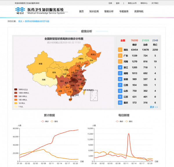 面对新冠肺炎疫情发展的严峻形势,中国工程科技知识中心医药卫生分中心团队基于已有技术积累与建设经验,快速构建了新型冠状病毒肺炎防控专题栏目,对当前疫情动态、肺炎防疫指南、定点诊治医院查询、权威报道、临床诊疗资源、医学文献、政策法规、公众关注热度等多方面的实时数据和权威知识进行采集与整合。专题每天实时更新疫情变化及公众关注度数据,利用可视化方式进行多维度展示,并依据每日疫情数据变化进行深层次数据解读与分析,整理撰写每日疫情快报,为公众解读疫情变化后的潜在信息;同时,每天由院士推送团队整合凝练热点权威新闻资讯、专家观点、防控知识以及科研动态等内容,方便用户快速获取精炼高价值信息。