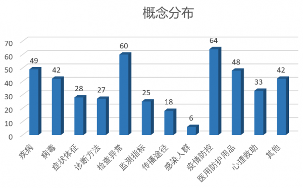 COVID Term以概念为单位对收集、整理的术语进行规范组织。概念表现为一组术语,这些术语间具有相同或相近的意义。图2是COVID Term V1.1版本中的概念分布。