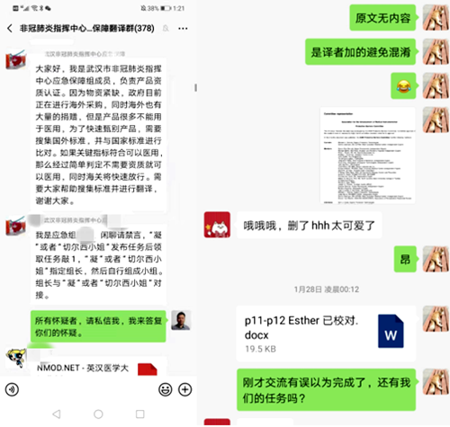 1月27日以来,2016级细胞生物学博士研究生、学生党员范玉萍,发挥自身医学背景和特长,加入到武汉新冠肺炎指挥中心应急保障志愿翻译群,参与《医疗保健设施中使用的防护服和防护布的液体阻挡层性能和分类 》等翻译及校对工作。