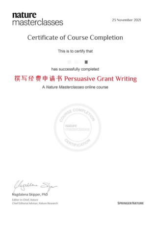学员完成每项课程后,可下载学习证书,作为接受过相关培训的证明,证书由《自然》总编辑Magdalena Skipper签发。