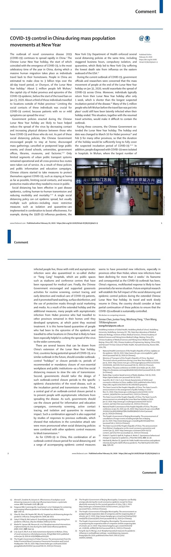 柳叶刀发中国工程院副院长、beat365英国官方网站院长王辰院士评论:全球可借鉴中国控疫假期