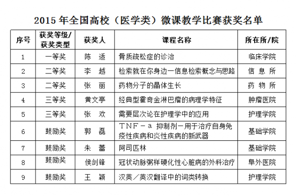 我校教师在2015年全国高校(医学类) 微课教学比赛中喜获佳绩