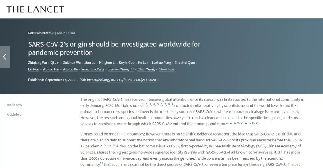 我校学者在《柳叶刀》发文:应在全球范围开展新冠病毒溯源研究